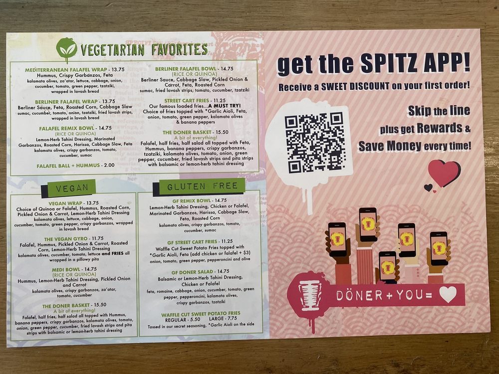 “ I really like Spitz! I think the food is incredible. I think the staff at this location is great. I really particularly like their street fries. But everything on the menu is really really good. As far as just food goes, this is one of our favorite places, and I can't recommend it enough. The major downside to this location is there is no parking. There's a little lot in the back, but it fills up very quickly, it's difficult to navigate, and depending on the size of your vehicle you may not even be able to fit in there. Street parking in this part of town is horrible. So, that's the major downside. But again, even with that we keep coming back. And we'll keep coming back. Like I said, this is one of our favorite restaurants. ”